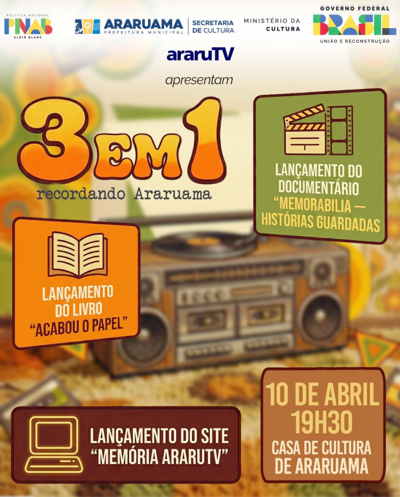 A preservação da identidade e da memória de Araruama ganha mais um capítulo no próximo mês. O Ponto de Cultura AraruTV realiza no dia 10 de abril de 2026, a partir das 19h30, o evento “3 em 1 – Recordando Araruama”. O encontro, que acontecerá na Casa de Cultura de Araruama, marca o lançamento simultâneo de três projetos que entram para o patrimônio imaterial da cidade, todos viabilizados pela Política Nacional Aldir Blanc (PNAB), com o apoio da Secretaria de Cultura de Araruama, do Ministério da Cultura e do Governo Federal.